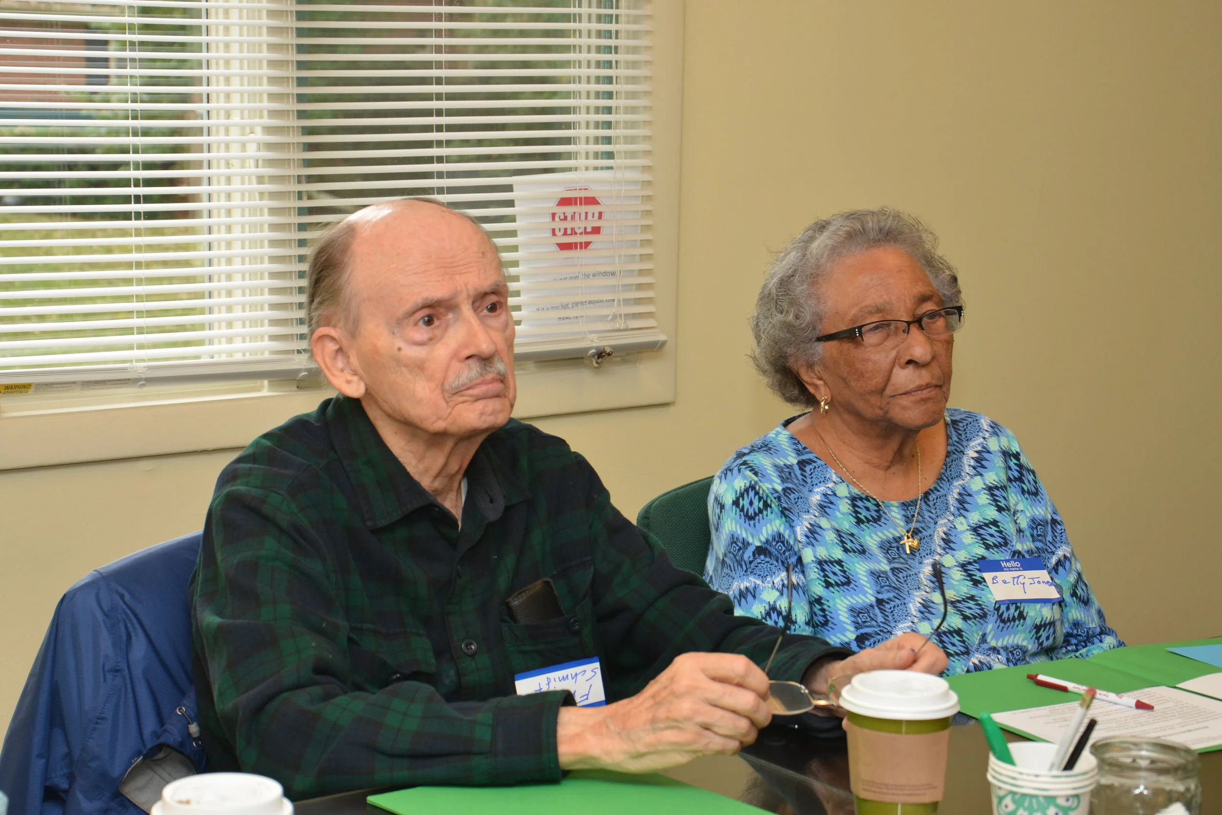 Two elderly people sitting at a table in a meeting room, with papers and coffee cups in front of them.